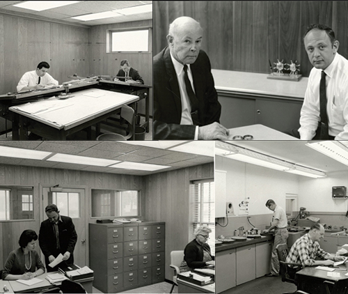 Bottom photos from left to right: Richard and Annabel Colby in the Front Office; Lapping & Packaging Room